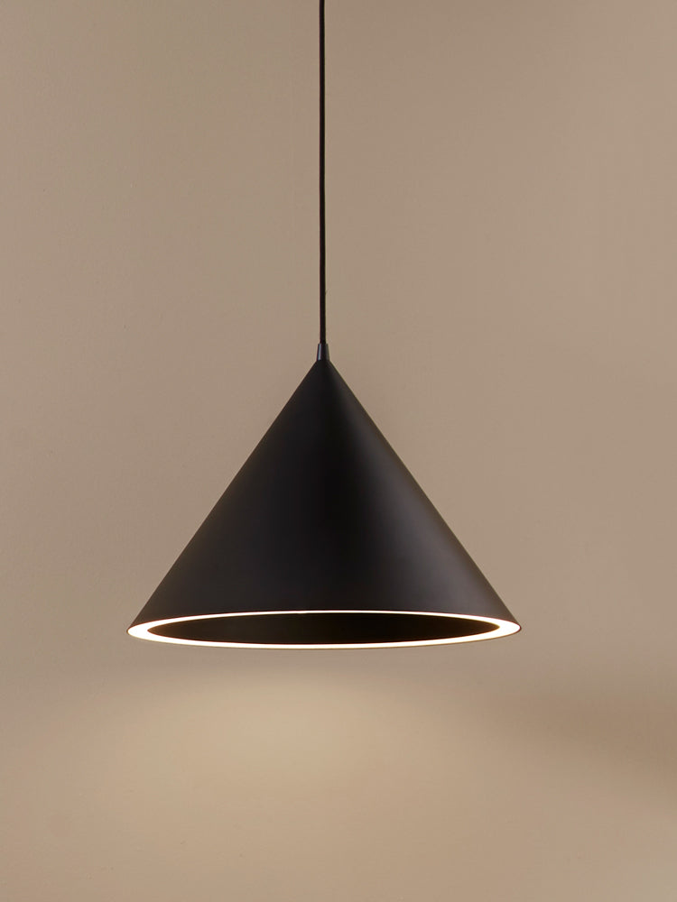 The Annular pendant is a modern interpretation of the classic cone pendant. It pairs two primary forms; a conical shade paired with a perfect ring of light at the perimeter. The innovative use of LED makes the bulb invisible creating a clean expression that makes the Annular pendant ideal for placement above the dining table, sofa arrangement, or in the hallway. The lamp is available in different colors and sizes.