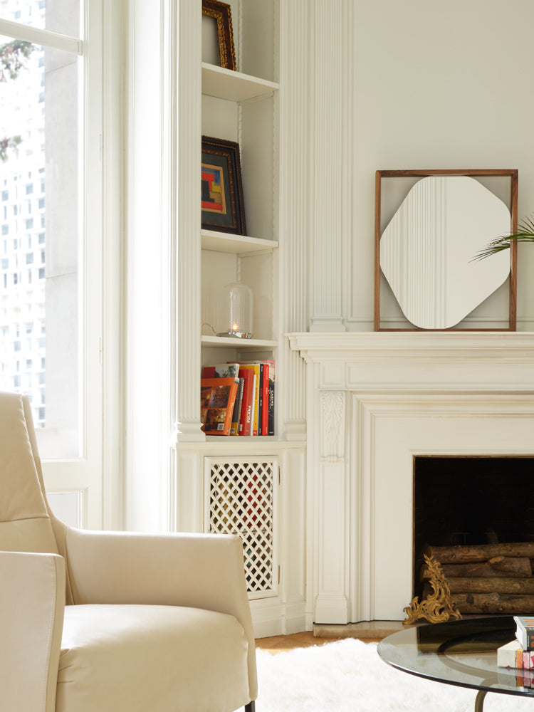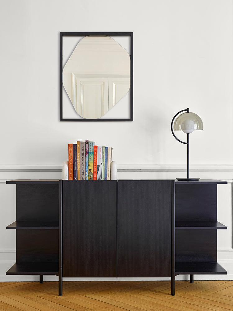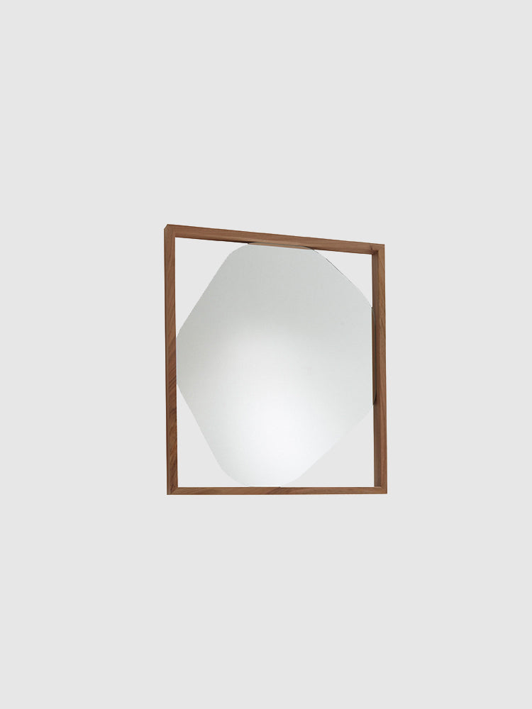 Mirror with frame in satin varnished natural American solid walnut, or matt varnished black-stained solid ash. The mirror glass is fixed to an MDF support with 2 struts which enable the mirror to be fixed to the wall either horizontally or vertically.