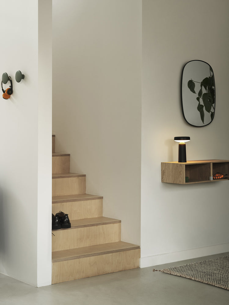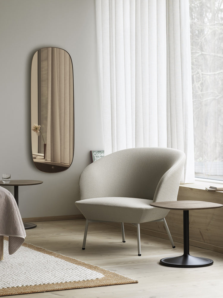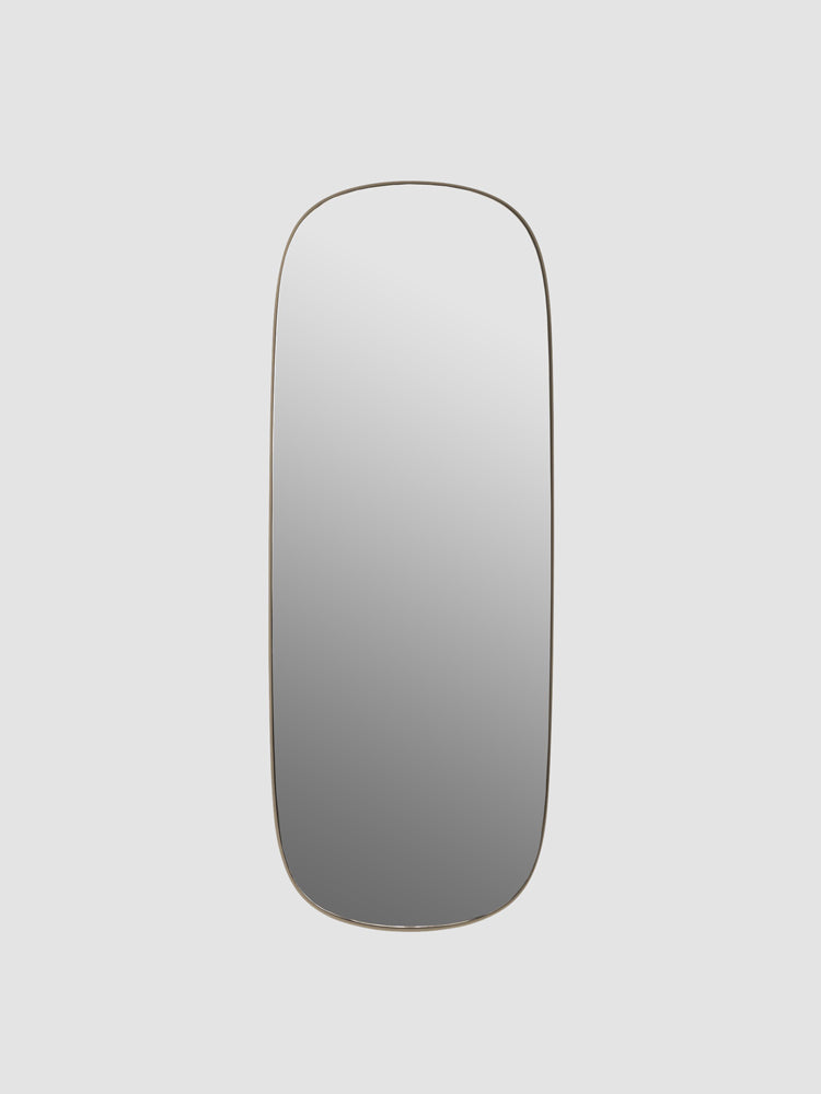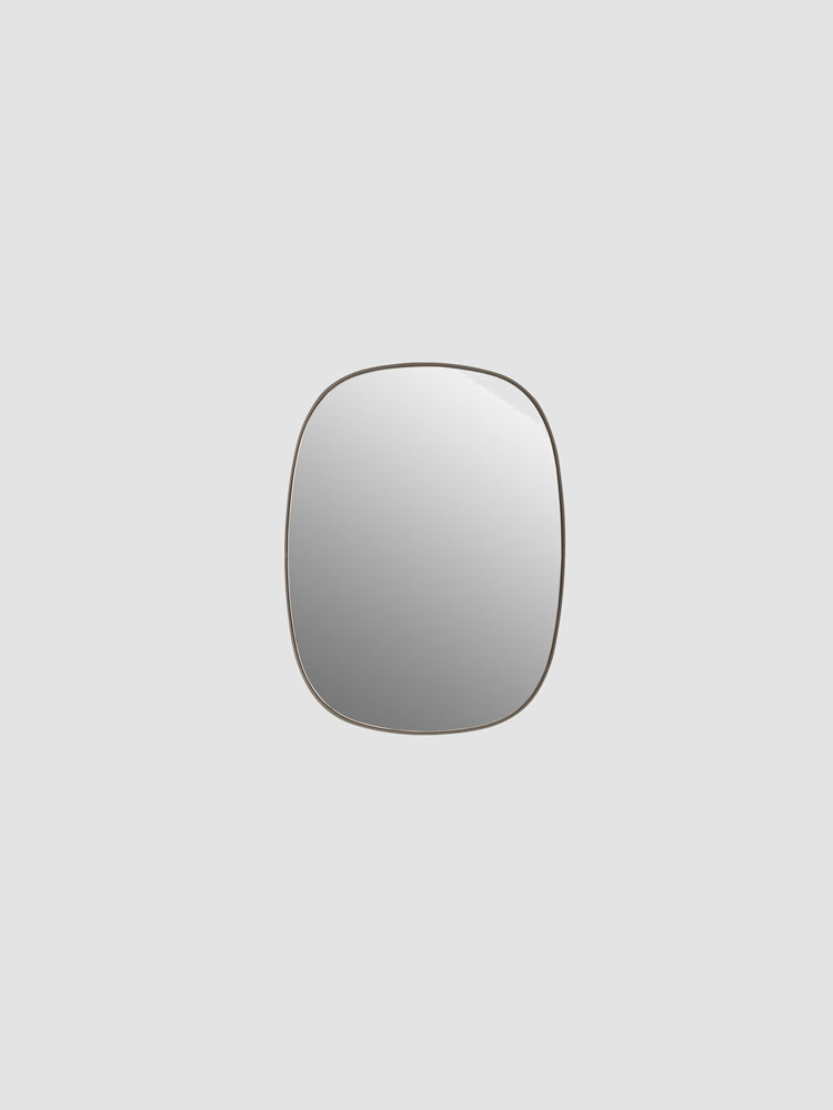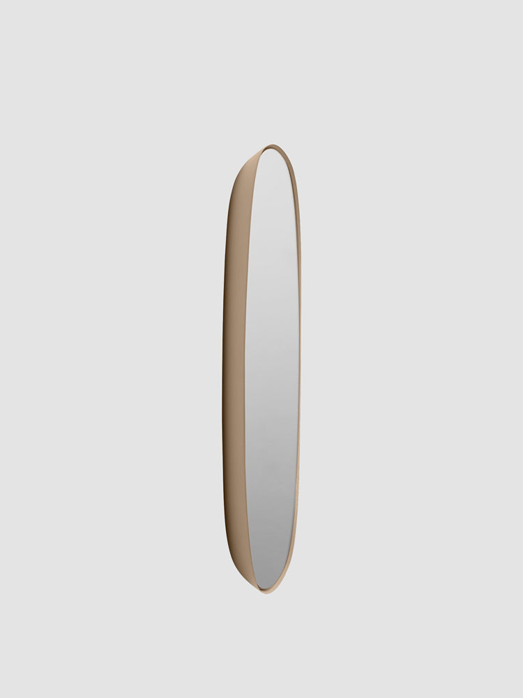 Powder coated steel. Mirror glass sheet. A steel plate is worked through three rounds to shape the mirror’s frame. The surface is powder coated. Lastly, the mirror glass is gently installed to create the little gap between the mirror’s frame and mirror glass.
