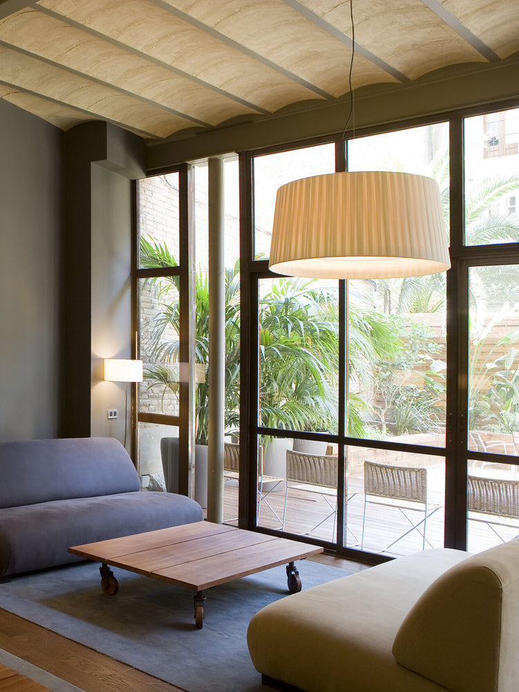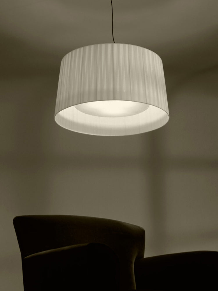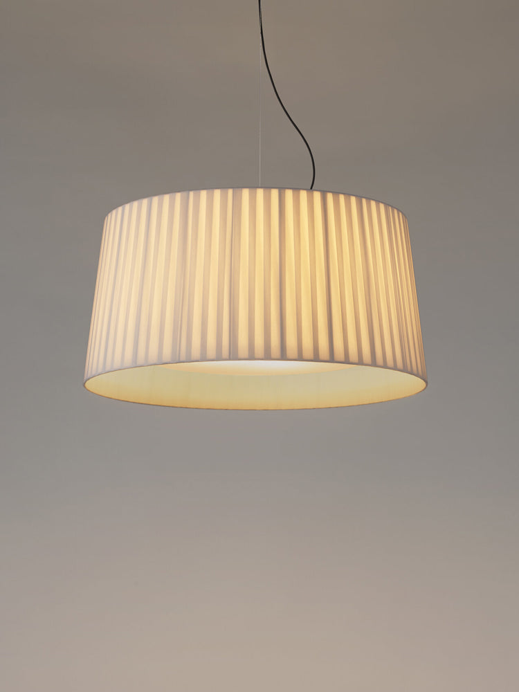 Designed for intermediate volumes and domestic areas, GT7 is larger, requiring a reinforced structure that adds a metal top disc to the lower diffuser disc. Santa & Cole advocates the use of ribboned shades to dress up every kind of light source, exploring different materials and playing with colours and hues.