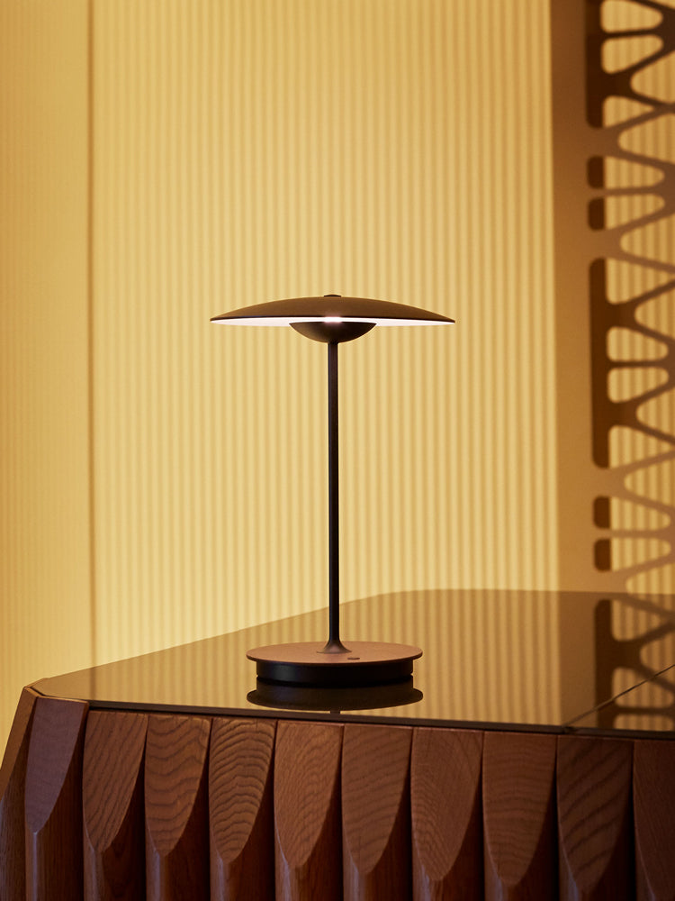 An extraordinarily lightweight light disk-shaped shade which pays tribute to the drums of Ginger Baker of Cream, the 1960’s rock band. The Ginger collection uses new materials and technology applied to the lighting sector: layers of wood and paper shaped under high pressure. The outcome is a lampshade measuring just 4 mm thick with a white interior to reflect the light and a high-quality wood finish on the outside. Shade available in either an oak or wenge finish & a lacquered black matte metal stem.