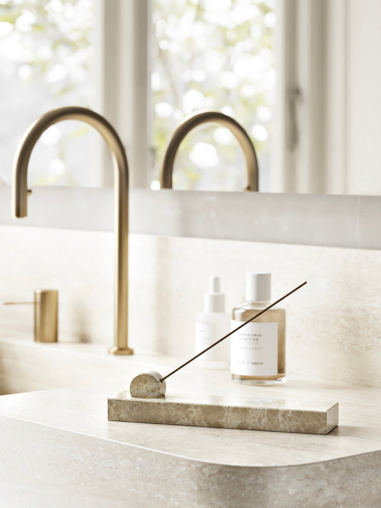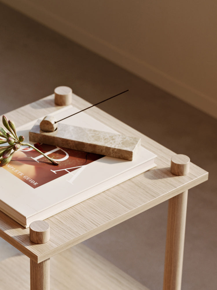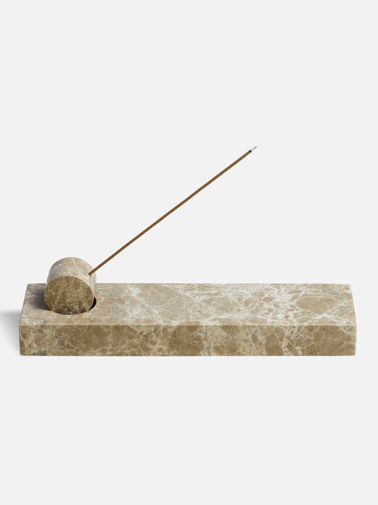 Made from a solid, rectangular block of marble, Monolith incense holder embraces contemplation and while-being while embodying production and material optimisation. The cylindrical holder is cut out of the block, leaving a hollow centre to place the piece vertically. Clever use of counterweight and friction holds the incense sticks at the perfect angle while the plate provides a platform for burning incense cones or a piece of lava rock, which serves as an essential oil diffuser.Â