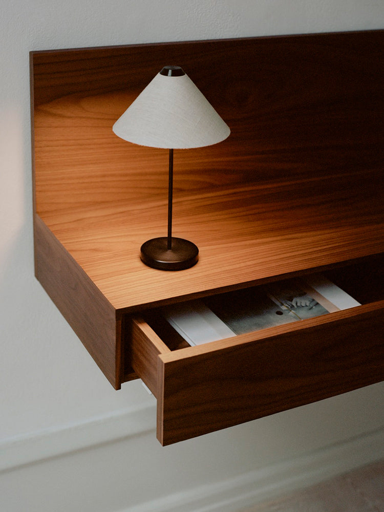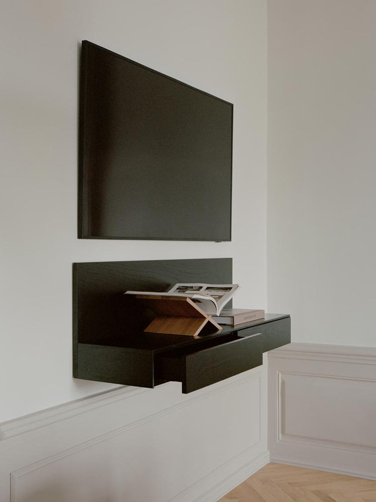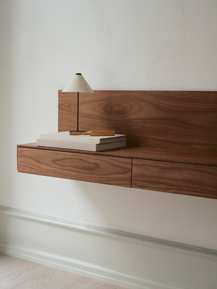 Tana is a series of wall-mounted furniture pieces designed by architect Rikke Rützou Arnved. What they all have in common is a simple expression that is neither disturbed by handles nor suspensions, but where straight lines and clean surfaces are allowed to stand in their undisturbed form. Tana consists in its cornerstone of surfaces in wood that find each other in an effortless encounter. The horizontal surface creates a ledge for objects, while its vertical surface frames and forms a calm, coherent background for what you place on the furniture.