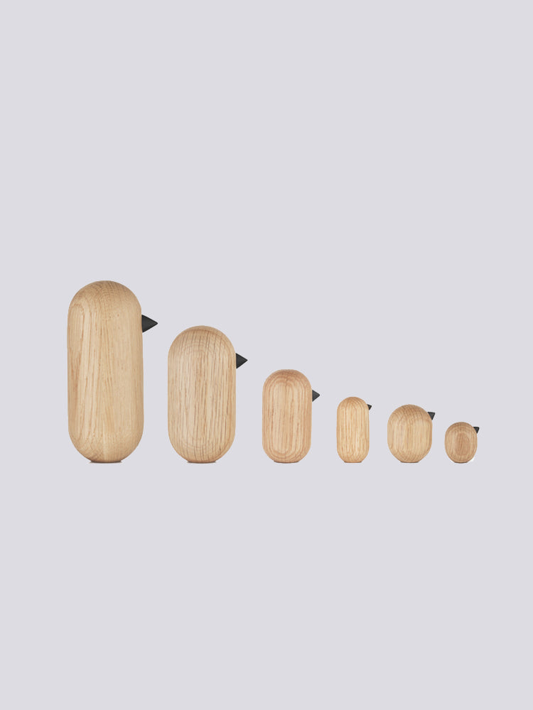 Little Bird is a range of irresistible decorative figures designed by designer Jan Christian Delfs. The simple, but expressive, design represents a well-balanced mix of purity, abstraction, minimalism and, not least, cuteness. The birds are turned in wood with the fine and characteristic beak as the sole detail. The six different sizes in the range each represent a particular character in the designer's own family, where tiny design related variations give the birds personality. Solid oak.