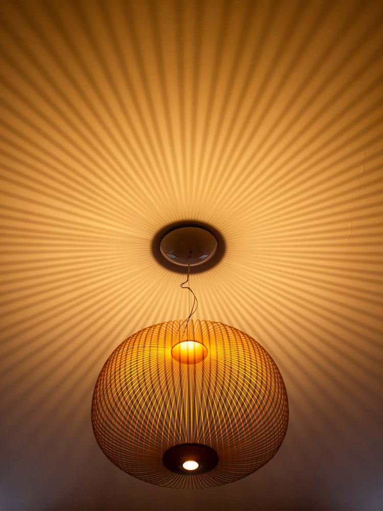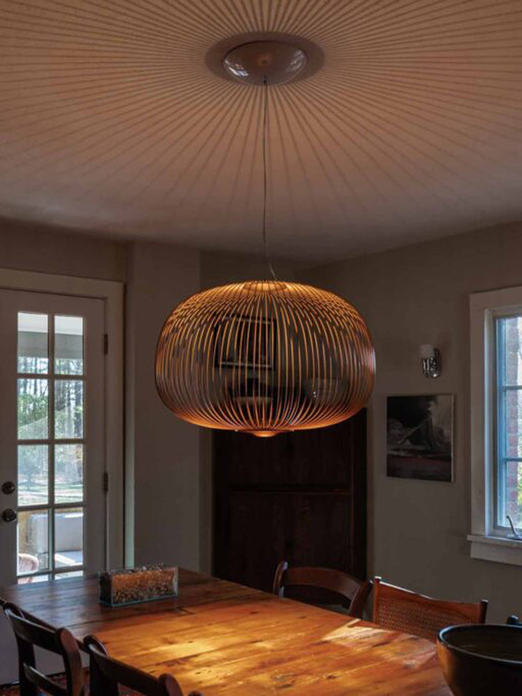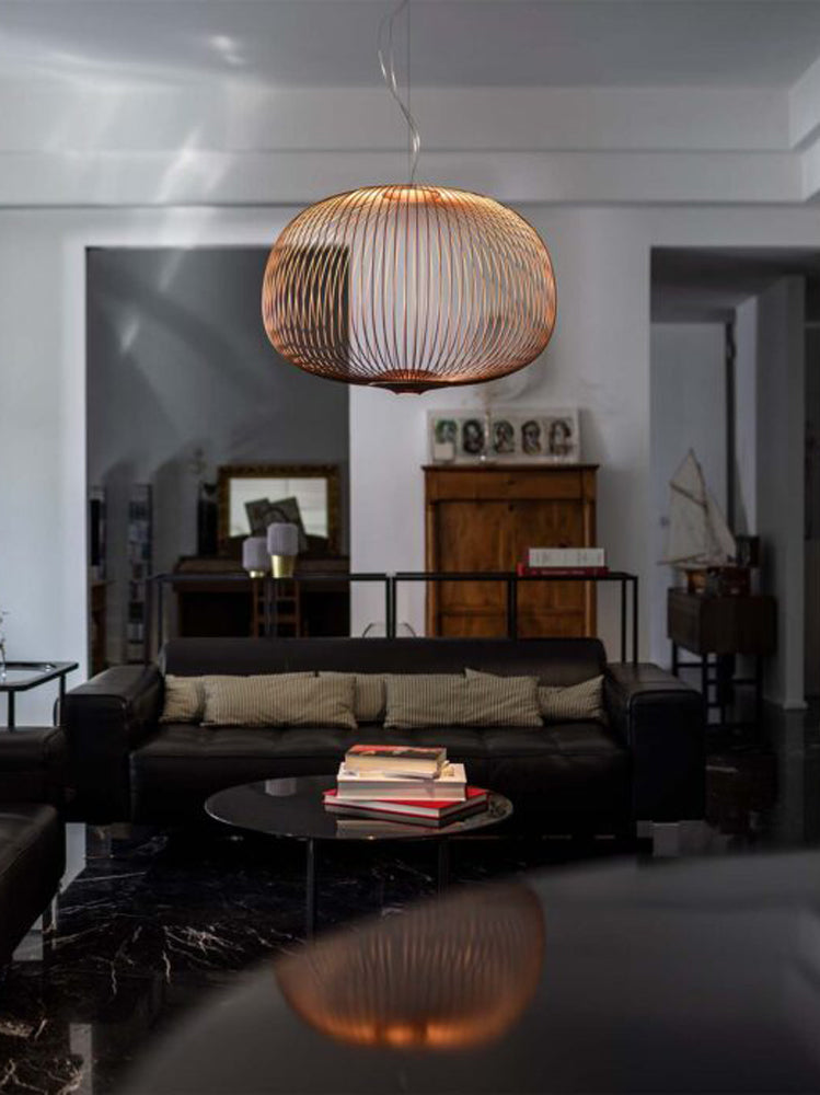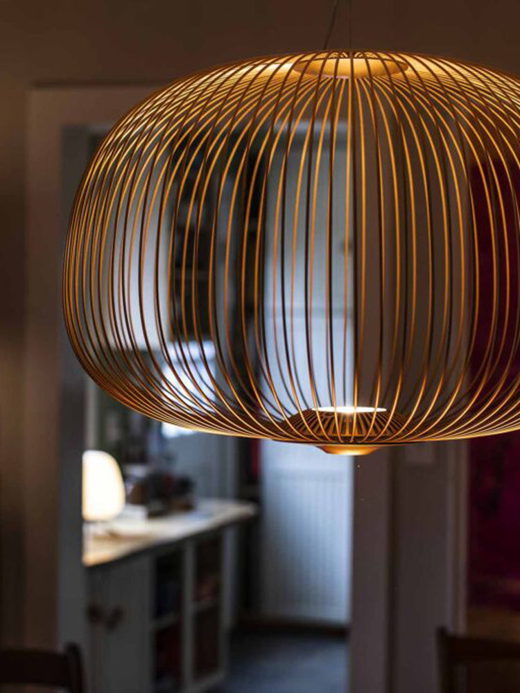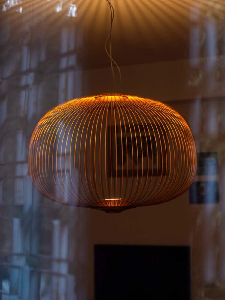The Spokes 1 pendant light is inspired by antique oriental lanterns. Featuring a cage shade made of filigree steel tubes, this design is more air and space than it is materials and mass. This shade construction is also influenced by the spokes of a bicycle wheel and its design, the result is a lamp that filters its light into a room. LED compatible and dimmable, you have the freedom to decide just how bright or soft this glow is. Its minimal wire flex cable does not draw attention from the light itself, and only adds to its weightless appearance. The Spokes 1 pendant light is ideal for a modern or contemporary aesthetic. Available in five finishes.