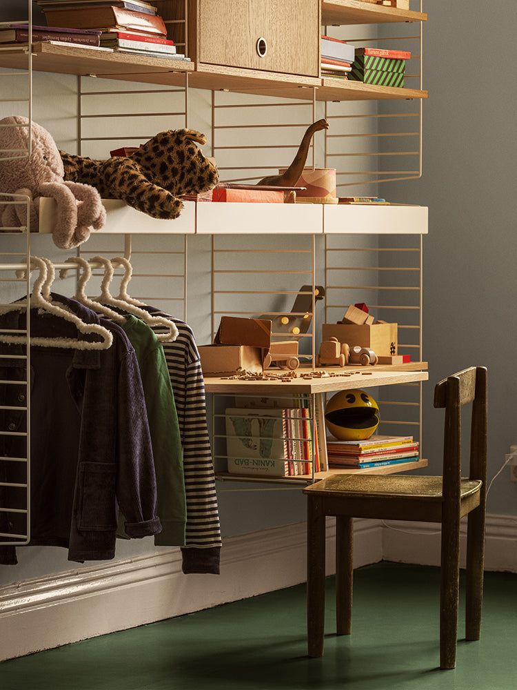 The work desk is available in two sizes, 58x58 cm and 78x58 cm, and fits into wire panels from String® System with depth 30 cm. The work desk can easily be adjusted to your preferred height and can be used in an office, kitchen, hallway, or any other room where you might have the need for an additional table. Make your workspace complete by mounting a works drawer underneath the work desk where you can store pens, notebooks, and such. Each packaging contains one work desk, one ledge to place against the wall to stabilize the work desk along with brackets. Choose among different colours and wood types.