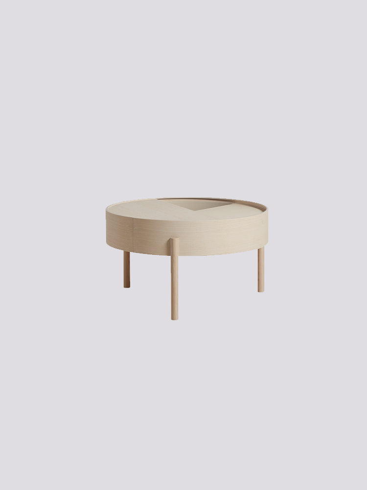 Arc takes its name from the mathematical concept of a smooth curve joining two points in a circle. The ARC table invites its user to make use of the simple functionalities. Use one finger to turn the upper tabletop. Let it be open with your favourite objects on display or close the lid to hide your mess.